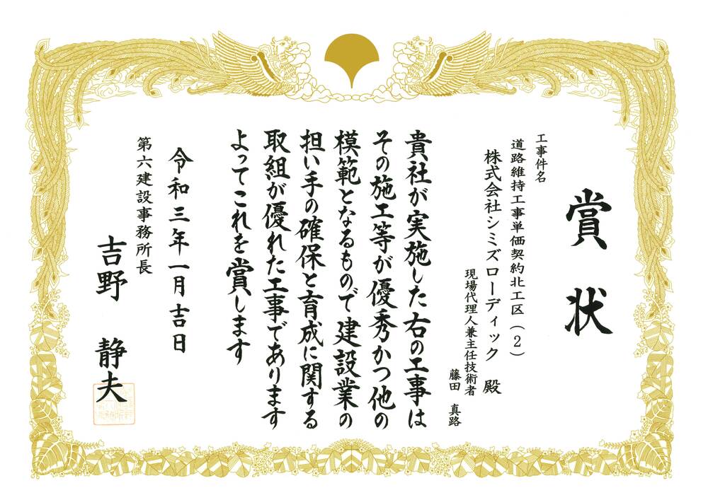 令和2年度に施工した「道路維持工事 単価契約 北工区(2)」において建設業の担い手の確保と育成に関する取組に対し、第六建設事務所長より賞状を頂きました。