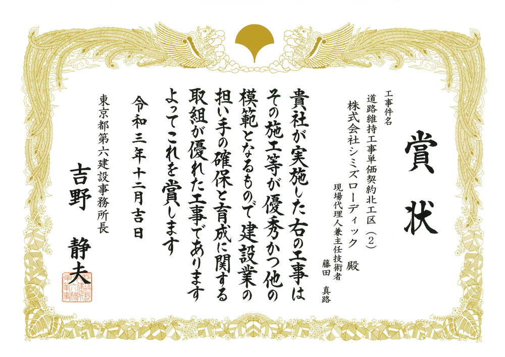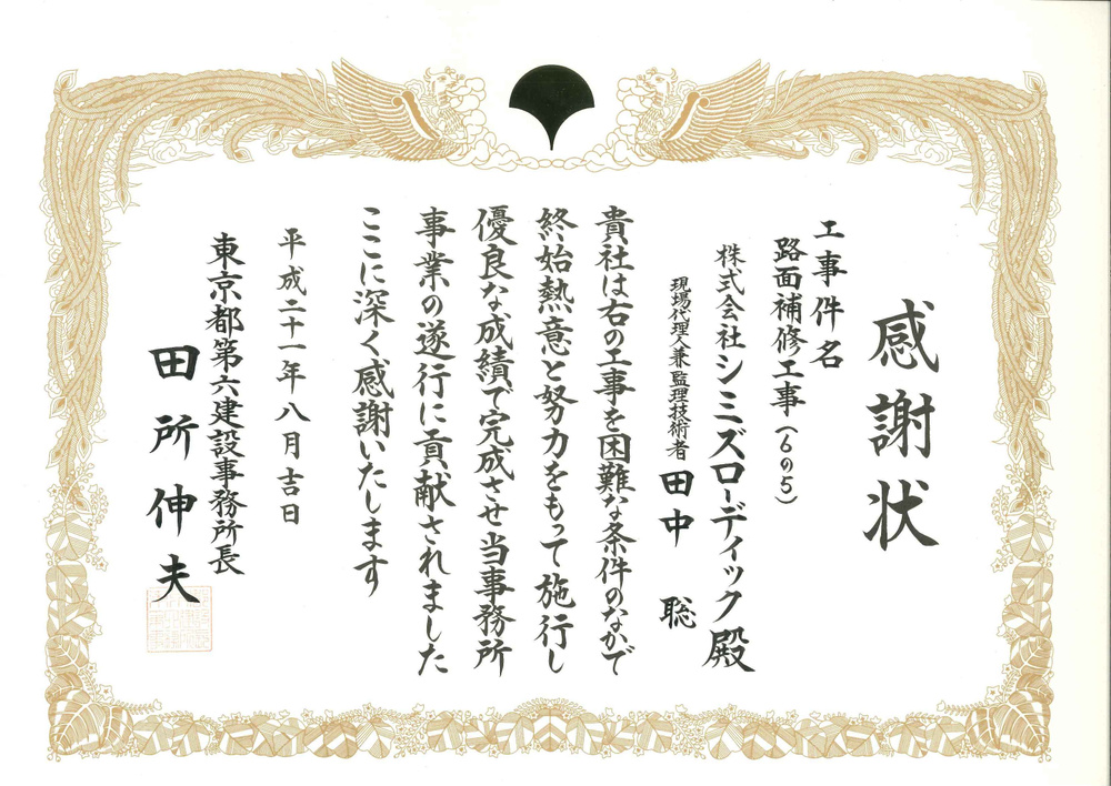平成20年度に施工した「路面補修工事(6の5)」において優良工事業者として、東京都第六建設事務所長より感謝状を頂きました。