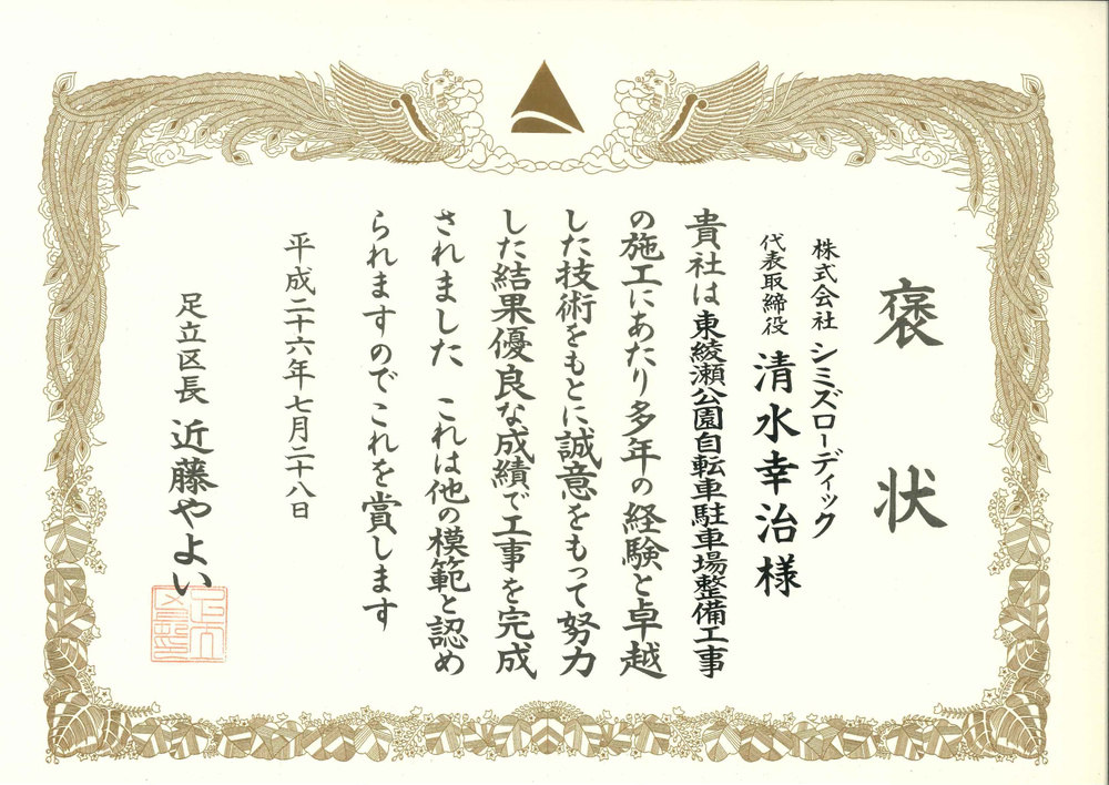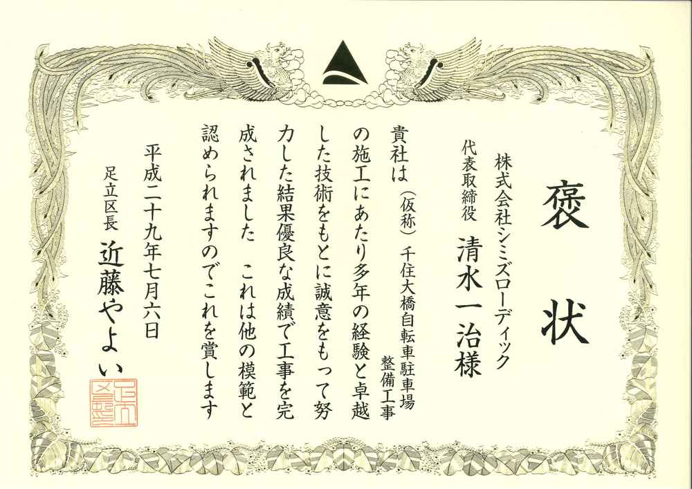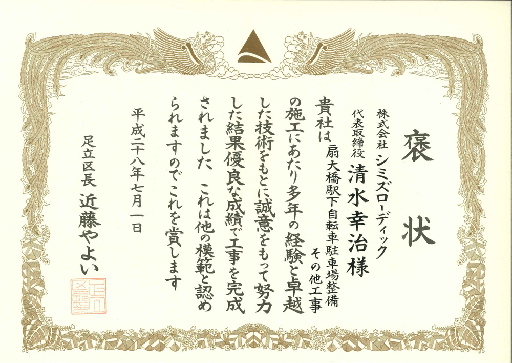 平成28年度に施工した「(仮称)千住大橋自転車駐車場整備工事」において優良工事業者として、足立区長より褒状を頂きました。