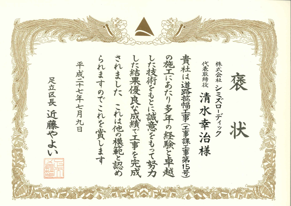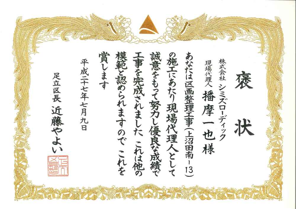 平成26年度に施工した「道路拡幅工事(工事課工事第15号)」、「区画整理工事(上沼田南―13)」において優良工事業者として、足立区長より褒状を頂きました。